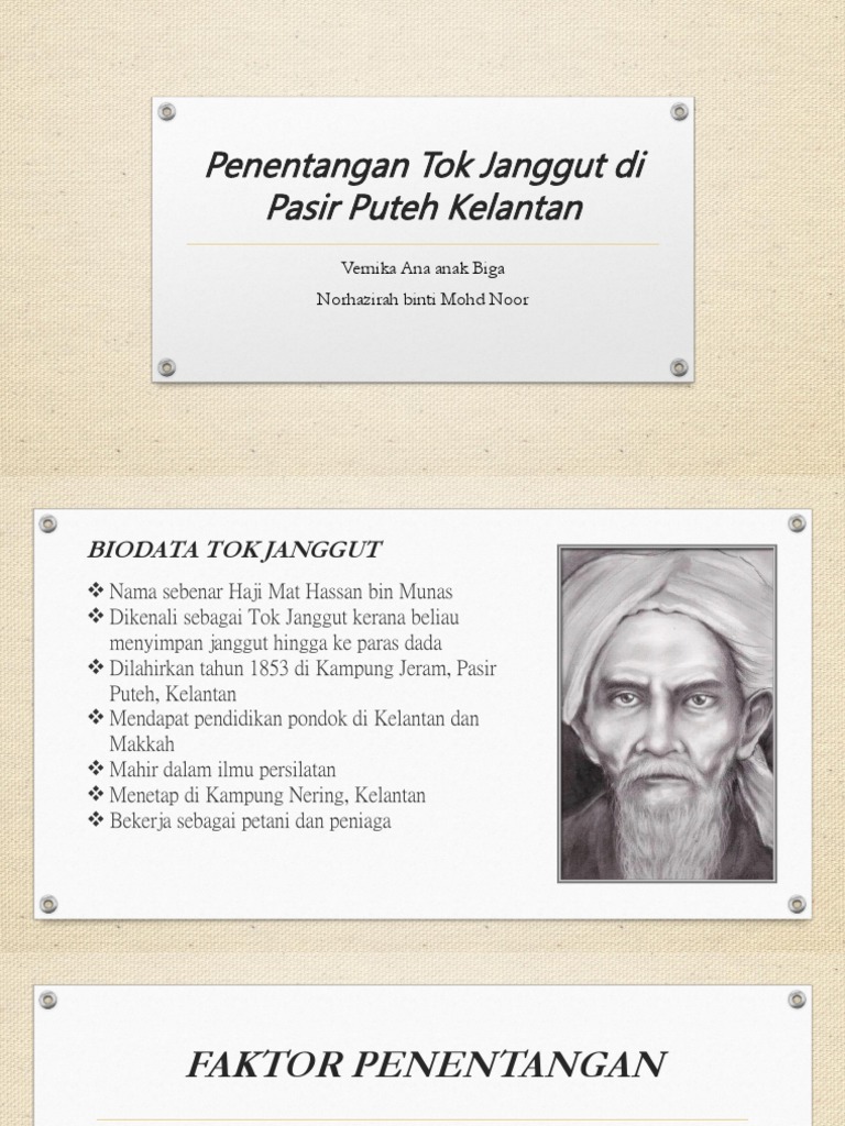 5 Classificação mais baixa. 1 82080 Votos Classificação mais alta. TOK JANGGUT TOK JANGGUT atau HAJI MAT HASSAN i Latar belakang nama sebenar Haji Mat Hassan bin Munas dikenali sebagai Tok Janggut kerana beliau menyimpan janggut hingga ke paras dada dilahirkan tahun 1853 di Kampung Jeram Pasir Puteh Kelantan mendapat pendidikan pondok di Kelantan dan Makkah mahir dalam.